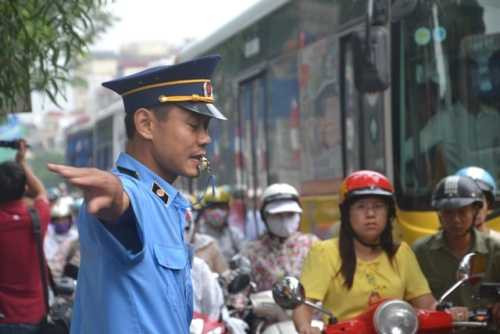 | Lực lượng chức năng phân luồng trên tuyến đường này (Ảnh: Minh Chiến) |