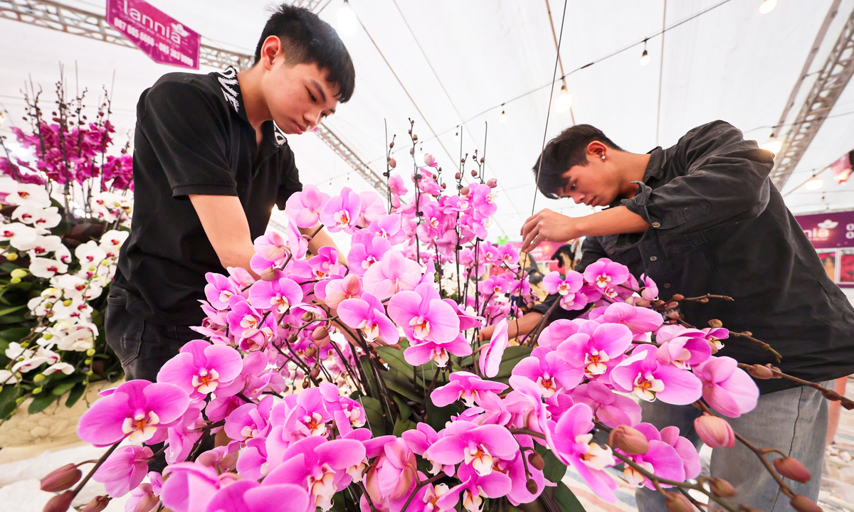 Ghi nhận tại một cửa hàng hoa lan gần Sân vận động Mỹ Đình, không khí làm việc diễn ra khẩn trương. Hơn 10 lao động đang chia nhau từng phần việc, từ cắt xốp, dựng khung đến cắm và tạo hình hoa.