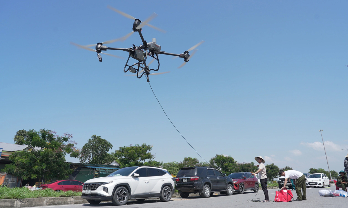 Máy bay không người lái vận chuyển hàng cứu trợ cho người dân trong vùng bị cô lập tại Thái Nguyên hồi tháng 10. (Ảnh: Trần Thọ)