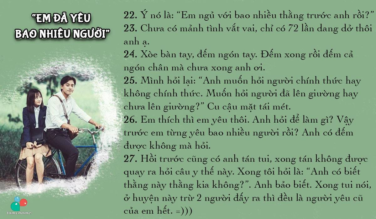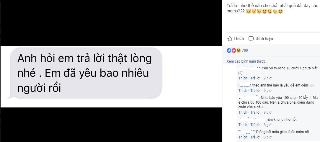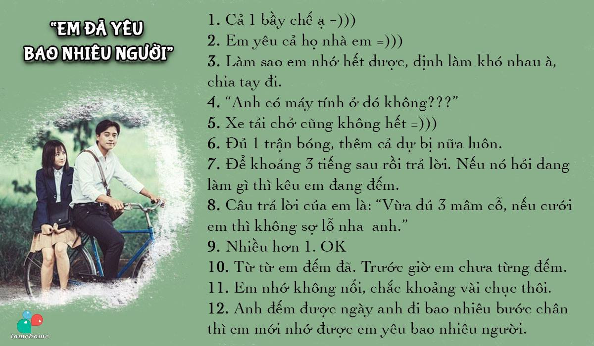 Những câu trả lời đầy tính “trả treo” và cũng rất sáng tạo của hội chị em cho câu hỏi: “Trước anh, em đã từng yêu bao nhiêu người rồi?” chắc chắn sẽ khiến người đọc phì cười, còn người nghe thì câm nín đó nha.