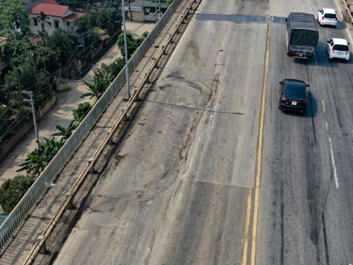 Nhiều đoạn trên cầu Thăng Long xuất hiện tình trạng lún, nứt, lồi lõm, gây nguy hiểm cho các phương tiện tham gia giao thông. (Ảnh: báo tin tức).
