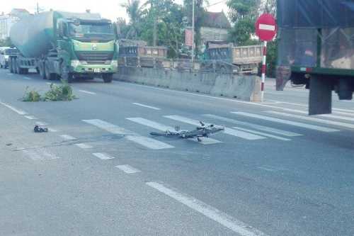 Tại hiện trường, xe đạp bị ôtô tải cán hư hỏng, nhiều vệt máu loang lổ. Rất đông người dân tập trung chứng kiến.