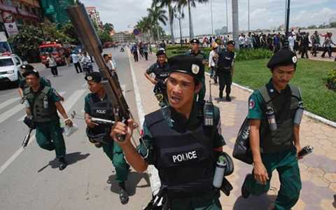 | Cảnh sát Campuchia với súng bắn đạn hơi cay trong một cuộc biểu tình tại Phompenh tháng 9.2013 (Ảnh: Reuters) |