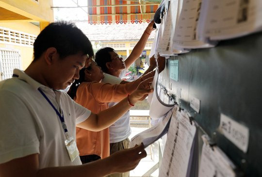 Các nhân viên bầu cử kiểm tra danh sách cử tri tại một điểm bỏ phiếu ở thủ đô Phnom Penh ngày 28/7. (Ảnh: Reuters)