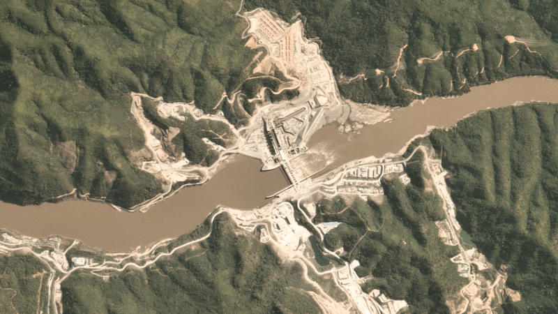 Hình ảnh chụp từ vệ tinh đập thủy điện Xayaburi trên sông Mekong. (Ảnh: Reuters)