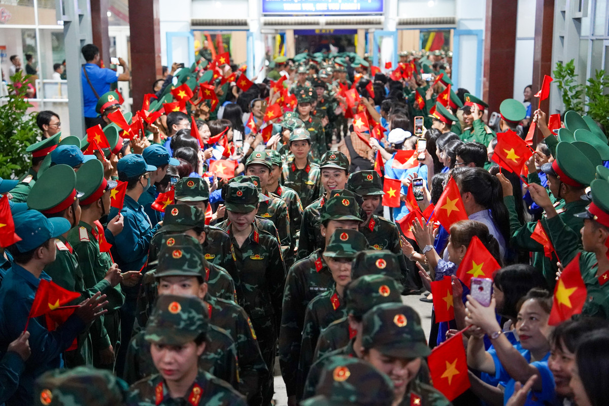 Giữa khung cảnh rộn ràng nhưng trang nghiêm tại sân ga, người thân, đồng đội và người dân đến tiễn các chiến sĩ lên đường, tạo nên hình ảnh xúc động, đậm chất quân dân gắn bó.