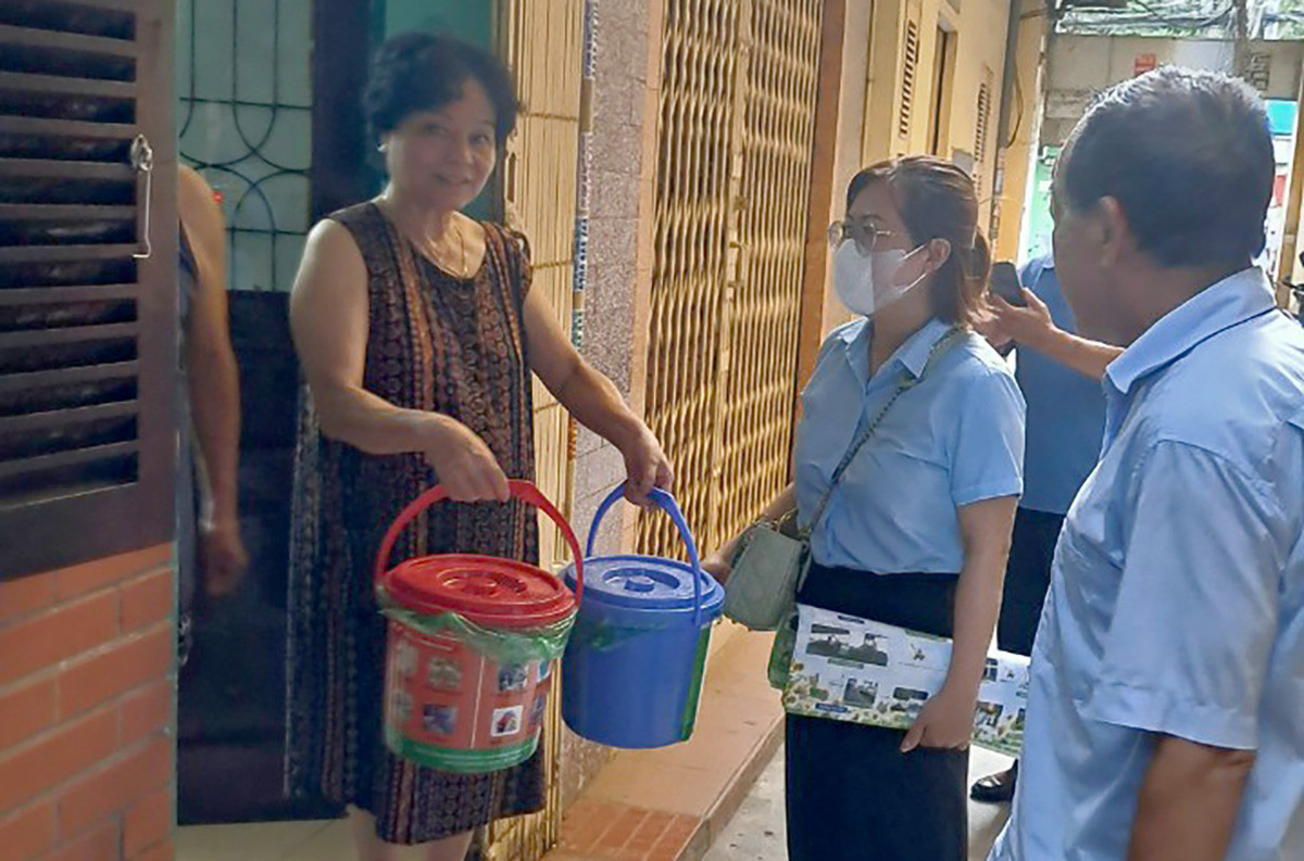 Cán bộ môi trường "đi từng ngõ, gõ từng nhà", tuyên truyền về phân loại rác tại nguồn.