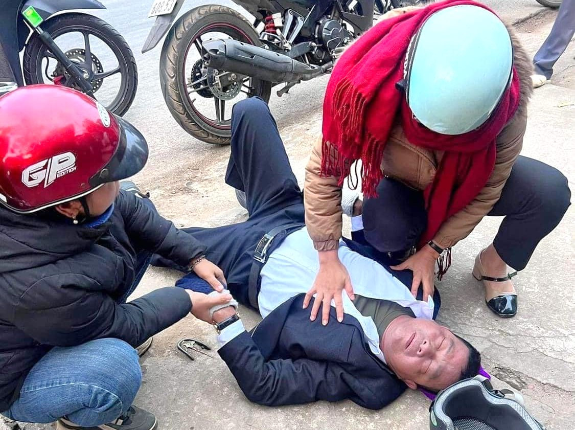 Sau khi dừng lại, người đàn ông nằm ngã, ngất xỉu bên đường. Chị Nguyệt lập tức dừng xe lại và cùng những người xung quanh đến kiểm tra, hỗ trợ.