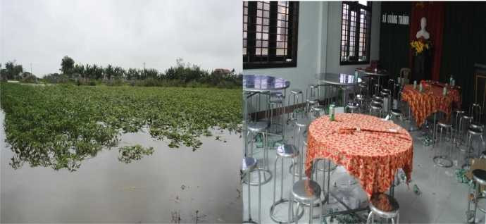 | Hậu trường lụt hoa màu đang “chết dần”. Hậu trường nhậu vẫn để lại đến sáng hôm sau. Ảnh Văn Tư |