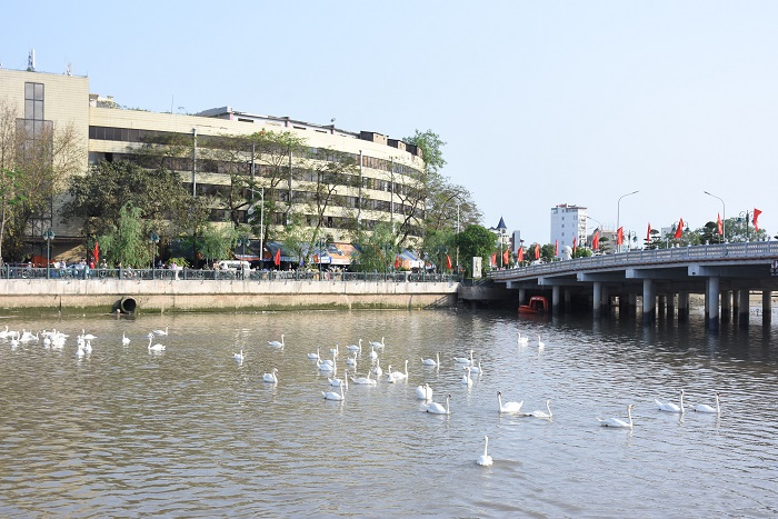 Tại lễ khánh thành Dự án đầu tư chỉnh trang sông Tam Bạc ngày 9/5/2019, quận Hồng Bàng tổ chức thả 20 đôi thiên nga xuống dòng sông.