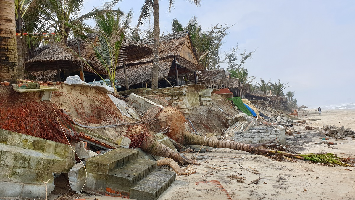 Nhiều nhà hàng ven bãi tắm vẫn chưa thu dọn những đống tàn dư sau sạt lở bờ biển.