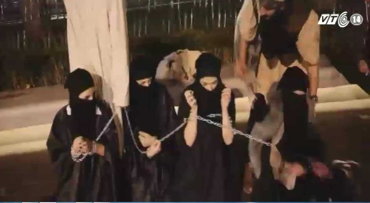 (VTC News) - Bốn phụ nữ mặc áo trùm đen kín mít bị xiềng xích, gào khóc tuyệt vọng, trong khi một tên phiến quân cầm loa đi quanh họ và rao bán với giá rẻ mạt.
