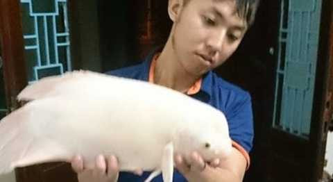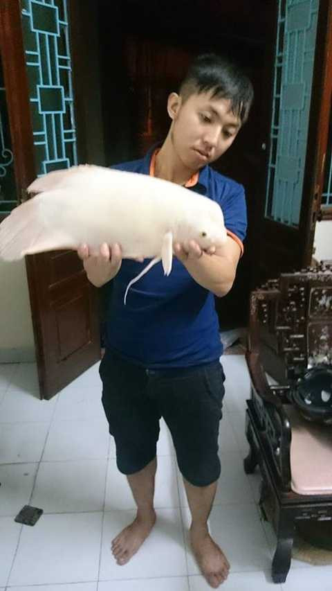 Con cá lạ màu trắng ở Hồ Tâyanh Huế mua nặng 3kg, toàn thân màu trắng, mắt màu đen. Đầu “quái ngư” gồ lên giống cá heo. “Khi thả cá lạ vào bể, tôi cho thịt lợn vào thì thấy con cá lao ra ăn”, anh Huế nói.