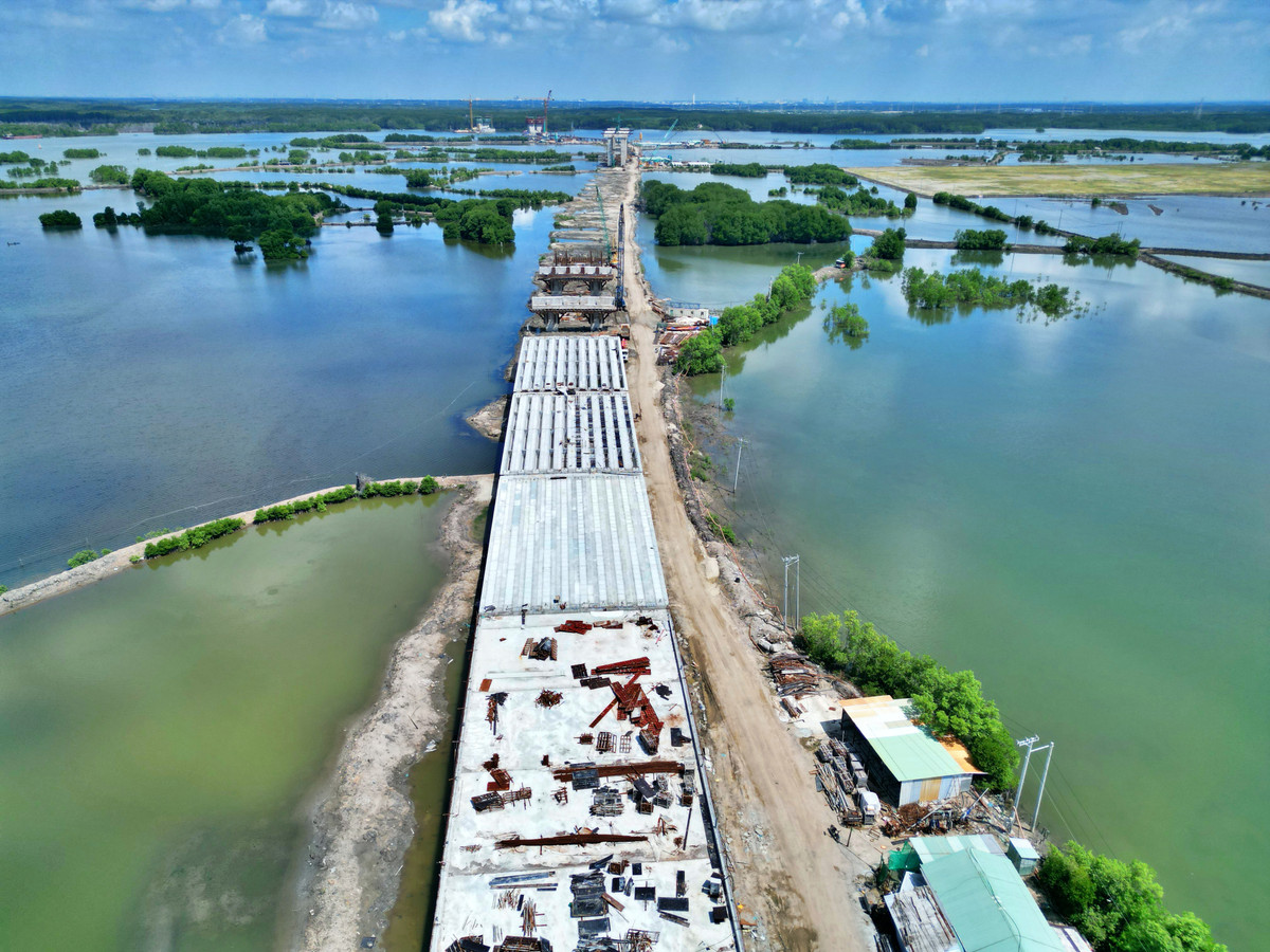 Theo quan sát, các trụ cầu dẫn của dự án bắt đầu vươn ra sông Thị Vải, trong đó hai trụ chính giữa sông đã nổi trên mặt nước.