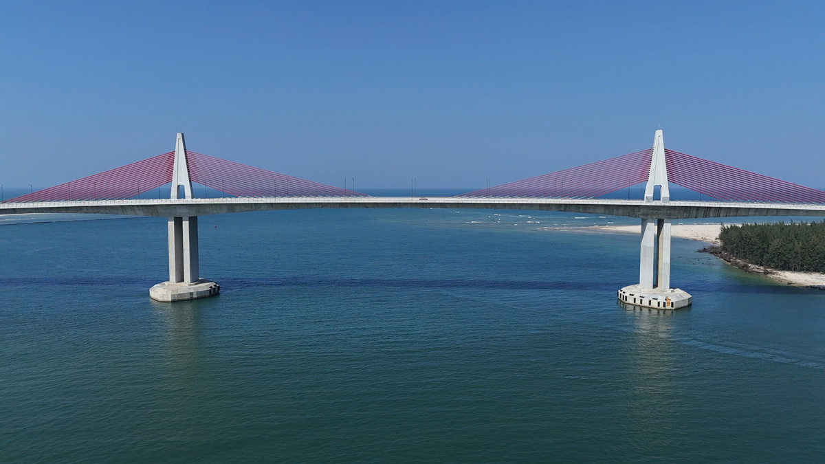 Điểm nổi bật của cây cầu là hệ thống dây văng màu đỏ, neo trên hai trụ chính hình chữ A vươn cao giữa cửa biển.