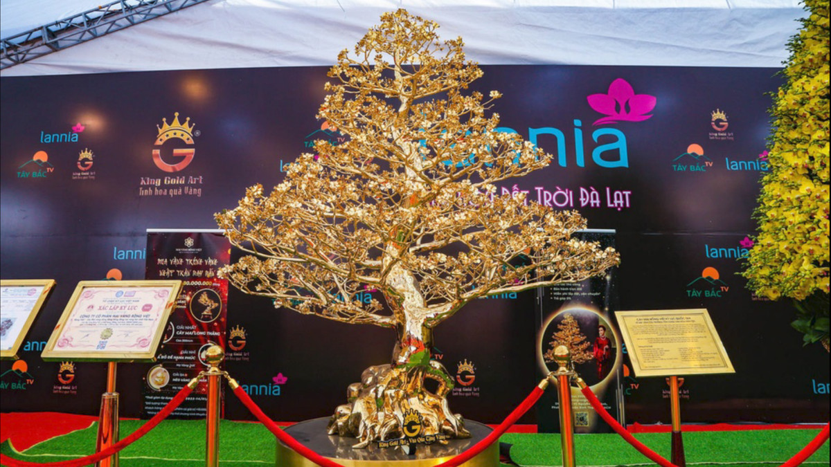 Cây mai mạ vàng chiều cao 3m, nặng 288kg được làm từ đồng mạ vàng 24K đang trưng bày tại một gian hàng cây cảnh tại Hà Nội, thu hút du khách đến tham quan, chụp ảnh.