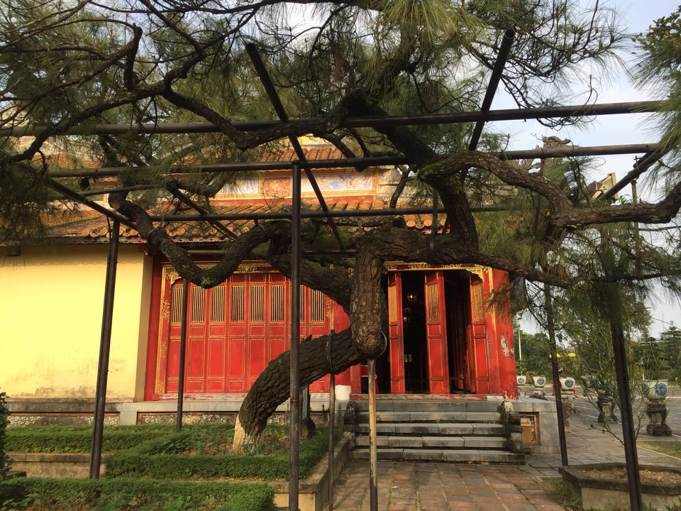 Hiện Trung tâm Bảo tồn di tích Cố đô Huế phải sử dụng các giá đỡ bằng sắt để bảo vệ cây thông cổ thụ có thế giống như con rồng đang bay lên trời xanh.