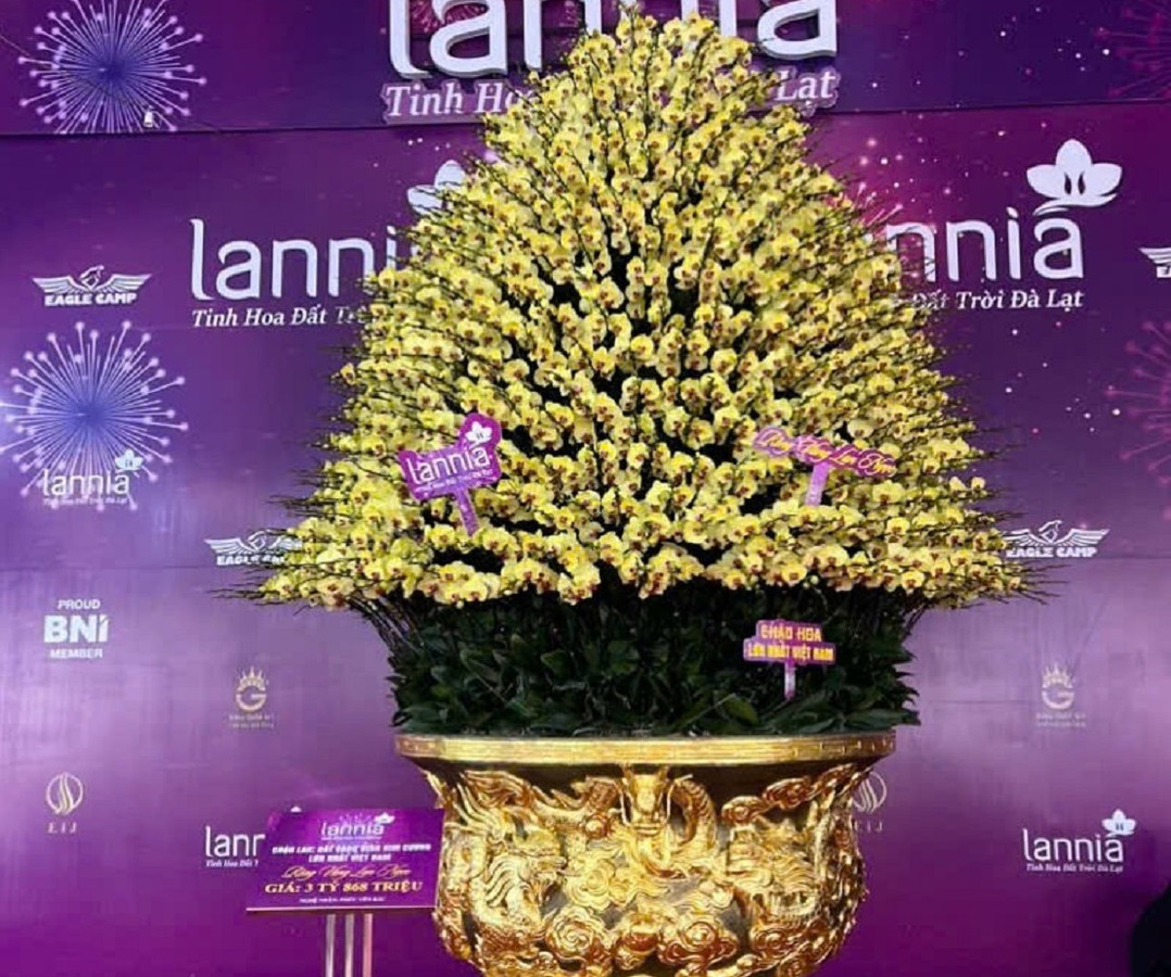 Chậu hoa được kết từ 2.868 cây hoa lan hồ điệp Đà Lạt với gần 20 tầng hoa, toàn bộ là màu vàng.