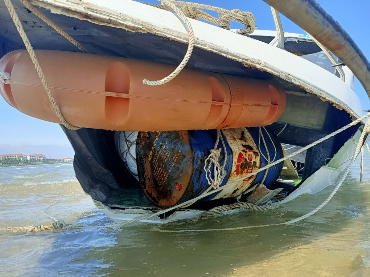 Chiếc ca nô gặp nạn được cột chặt và kéo vào vùng nước cạn cách bờ 150m.