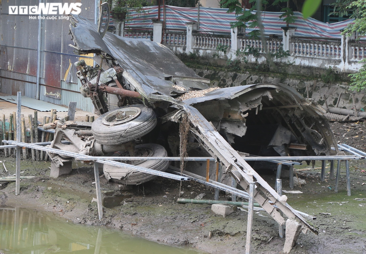 Phần xác chiếc máy bay B52 đặt trên khung sắt, một số bộ phận đã được tháo dỡ để tiện cho việc tu sửa, cải tạo.
