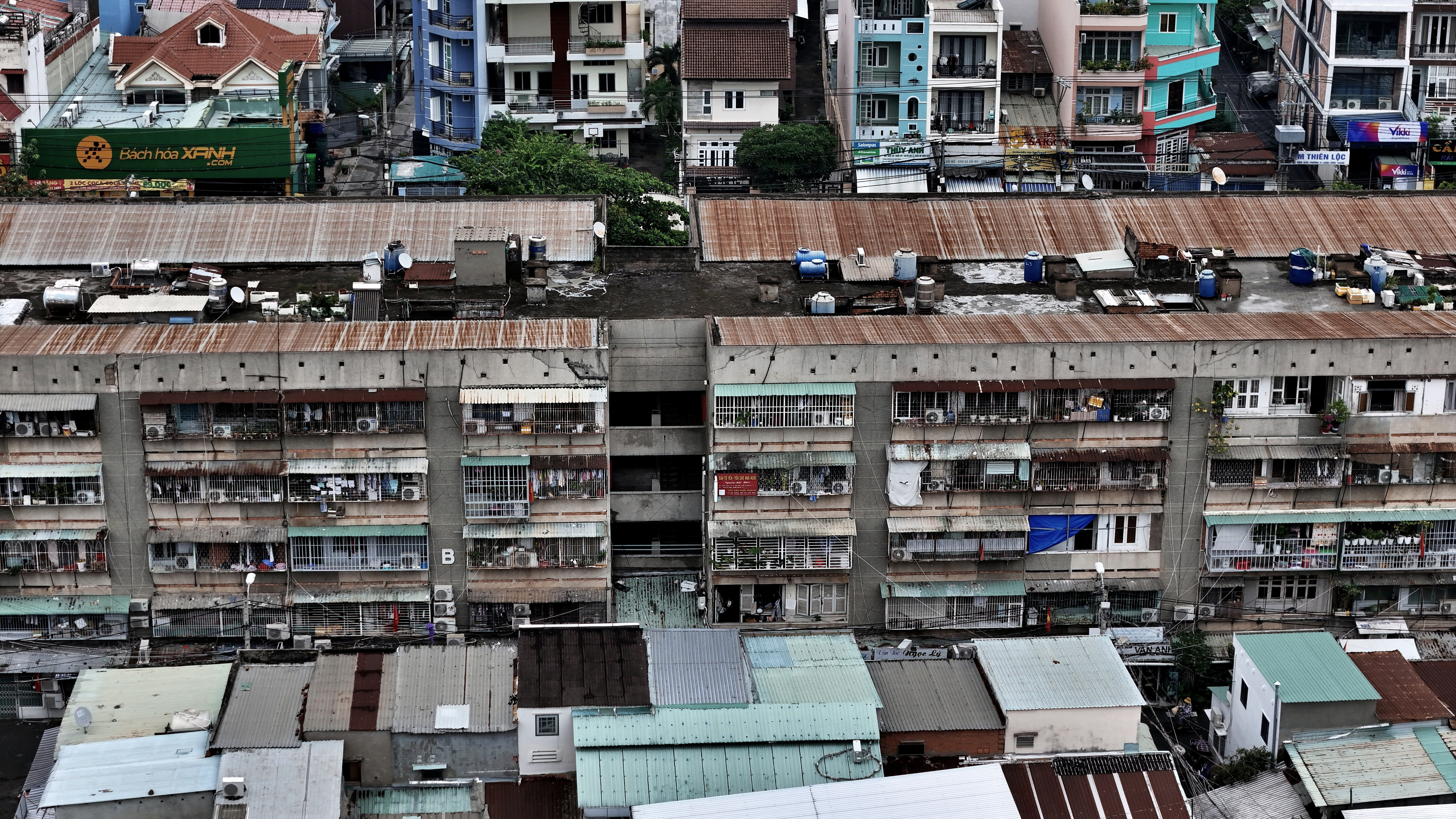 Còn tại chung cư Nguyễn Thiện Thuật (Quận 3 cũ), tình trạng xuống cấp đã kéo dài suốt nhiều năm. Những căn hộ cũ kỹ phủ rêu phong, nước sơn bong tróc từng mảng lớn, tường vữa nứt toác, lan can hoen gỉ, mục nát theo thời gian. Trên cao, loạt dây điện đen sì chằng chịt khắp mặt tiền các căn hộ, bám đầy trên tường, lan can và vắt ngang cả con hẻm phía dưới.
