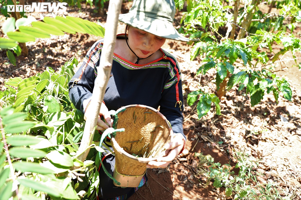 Không hề sợ hãi, người phụ nữ Ê Đê xinh đẹp này mê mải bắt những chú sâu muồng bám trên lá cây. Chị len vào giữa các cành cà phê, chăm chú tìm kiếm.