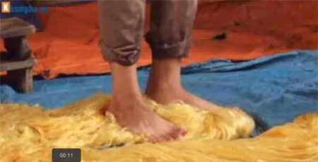 Đôi chân trần vừa đi trên đất những người làm miến Cự Đà không ngại ngần quần xéo, giẫm lên những sợi miến.