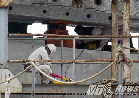 | Nhà thầu sử dụng công nghệ đúc các đốt dầm, dài 16m, rộng 3m, cao 3,2m, vận chuyển đến công trường lao lắp dầm, mỗi đốt dầm có trọng lượng gần 80 tấn |