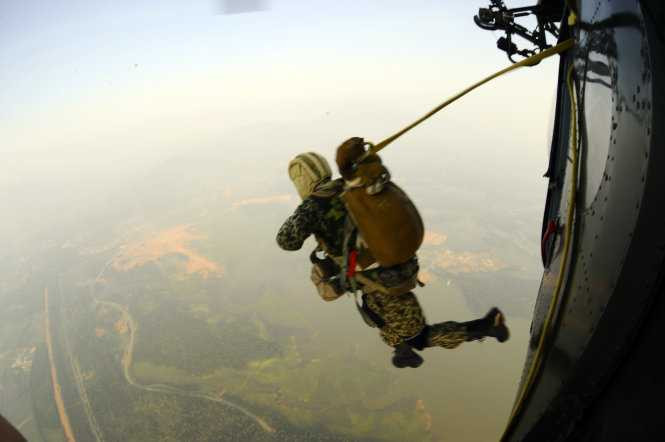 | Lần lượt, từng người lính đặc công nhảy dù ra khỏi máy bay - Ảnh: Trọng Hải |