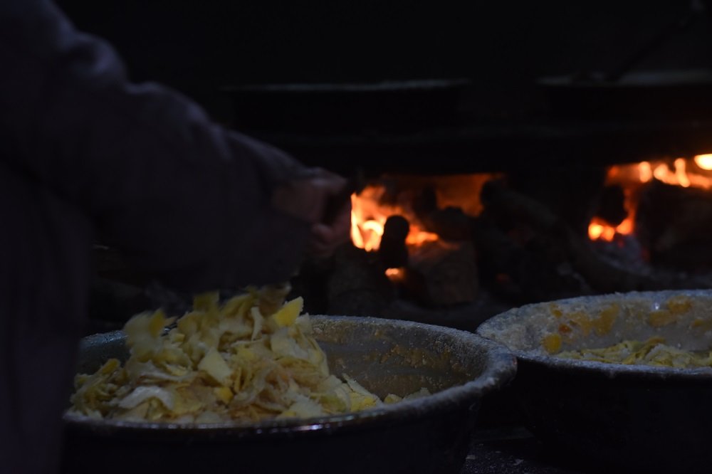 Những lát gững trộn lẫn đường sau đó được đun trong chảo đường trên bếp lửa trong khoảng một giờ đồng hồ. Trong thời gian này, người thợ phải dùng đũa đảo liên tục để tránh bị cháy.