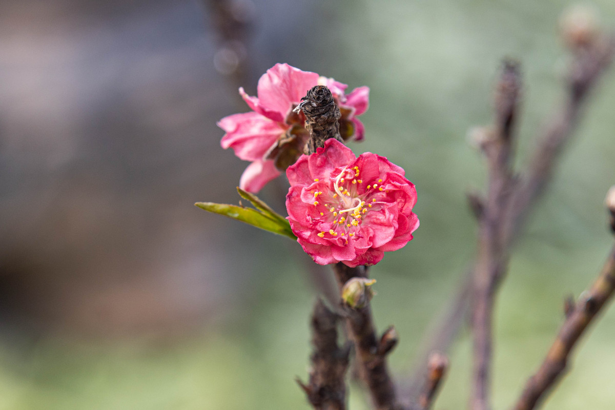 Hoa đào Thất Thốn mang một vẻ đẹp riêng biệt, màu sắc đậm nhưng không quá sẫm, bông nở to, cánh khép tràn đầy sức sống, lá dày, xanh thẫm.