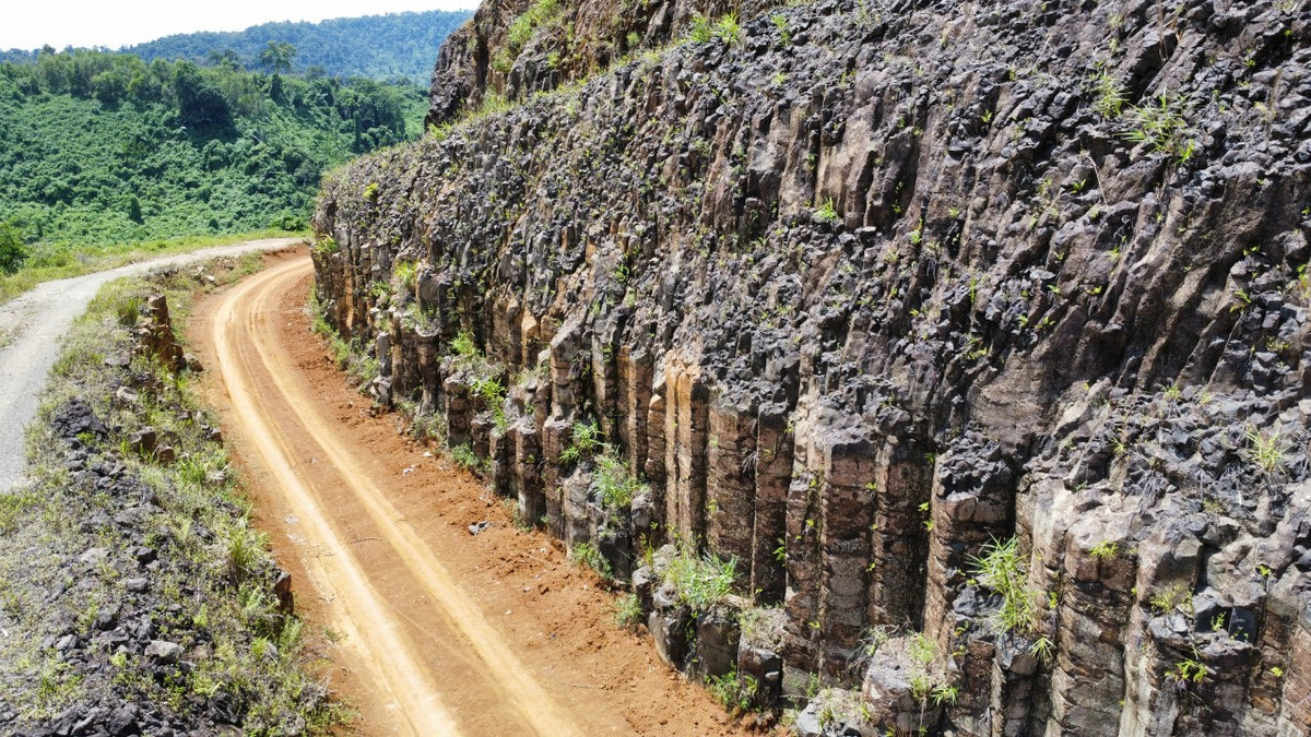Dãy núi đá dài gần 500m, phía dưới có dòng suối Đắk Chè, phía trên là rừng cây bao phủ.