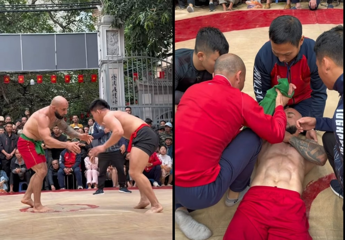 Đô vật Rafael so tài với Bạch Văn Nghĩa ở sới vật Mai Động (Hà Nội) - Ảnh cắt từ clip