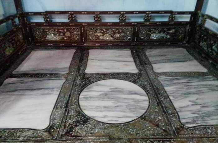 Trong hình là chiếc giường Thất Bảo chạm nổi hoa lá và khảm xà cừ cầu kỳ trong dinh thự đốc phủ Hải (Tiền Giang).