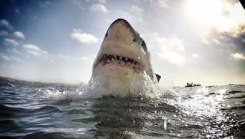 | Một con cá mập nhô đầu khỏi mặt nước khoe hàm răng sắc nhọn đáng sợ của nó. |