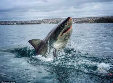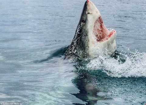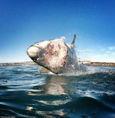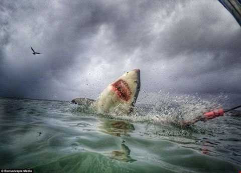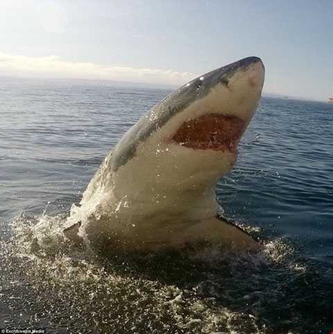 | Cận cảnh đầu một con cá mập khổng lồ lao khỏi mặt nước ở ngoài khơi vịnh Mossel, Nam Phi. Bức ảnh được nhiếp ảnh gia Brewer sử dụng camera GoPro để ghi lại. |