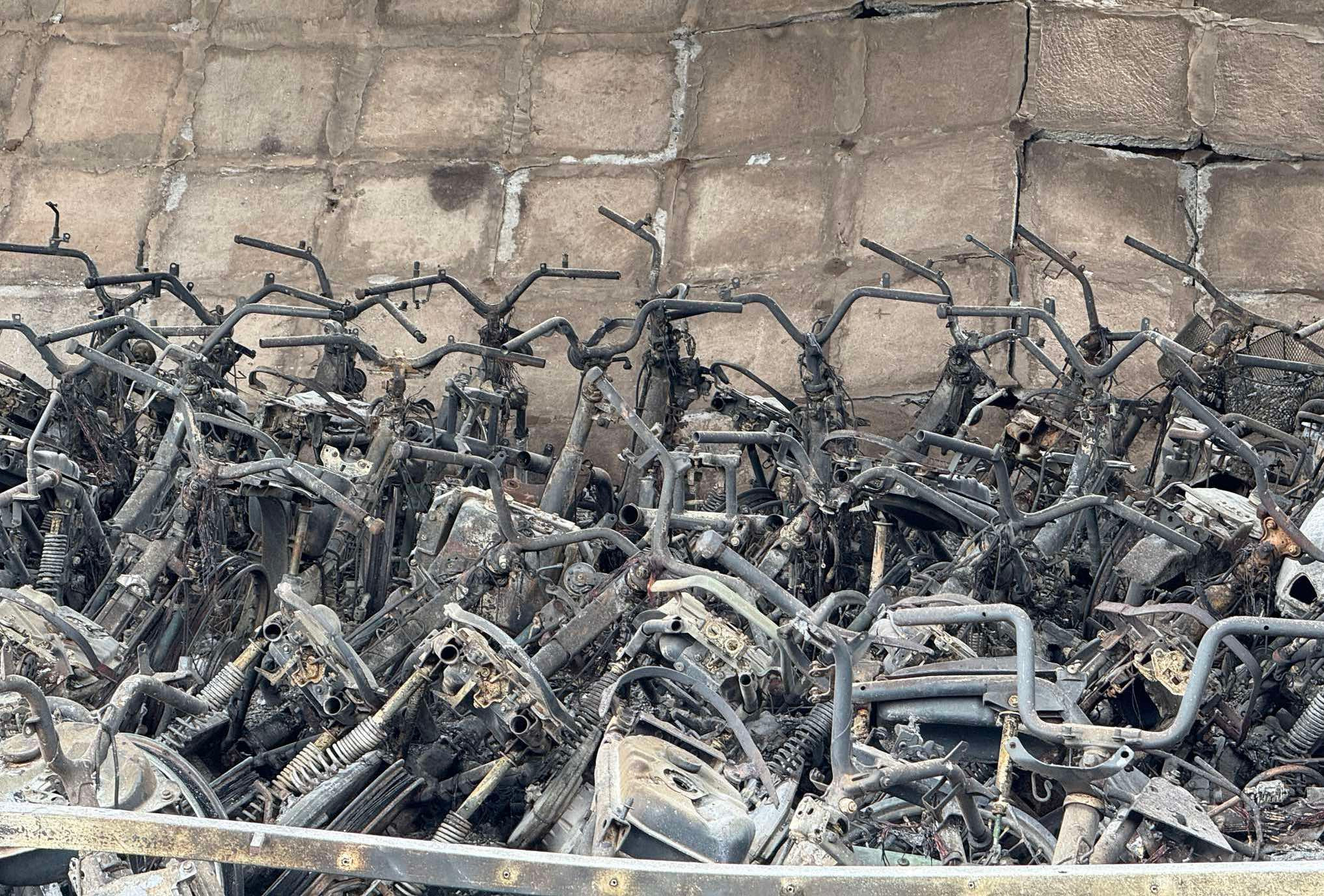 Vụ cháy không gây thiệt hại về người nhưng hàng trăm xe máy bị thiêu rụi hoàn toàn.