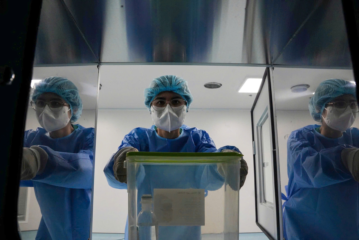 Trước khi vào phòng pha chế, thuốc đi qua một lớp “đệm” trung gian. Tại đây, thuốc được đóng trong hộp và sát khuẩn cẩn thận, sau đó chuyển vào khu vực vô khuẩn qua hộc trung chuyển hai chiều. Quy trình một chiều được áp dụng nhằm giảm thiểu nguy cơ nhiễm bẩn.