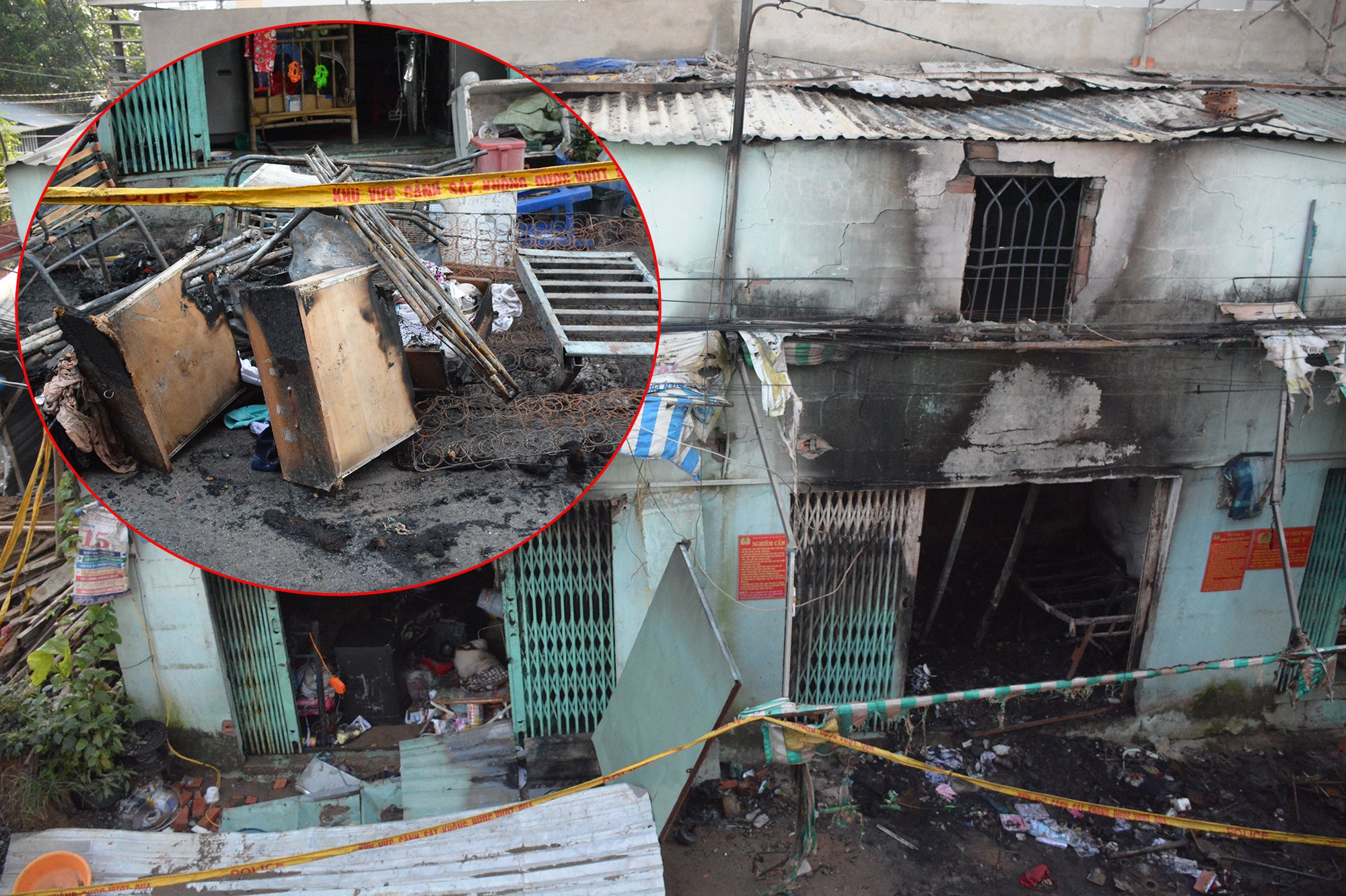 Căn nhà trọ gồm 3 phòng của gia đình nạn nhân gần như bị thiêu rụi hoàn toàn.