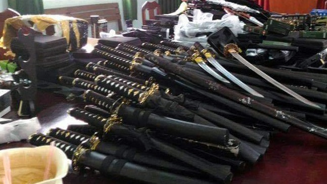 Công an đã thu giữ tang vật gồm 225 cây mã tấu, 37 lê, 17 súng điện, gần 50 kiếm Nhật ngắn dài đủ loại, roi điện, súng điện nhiều chủng loại.