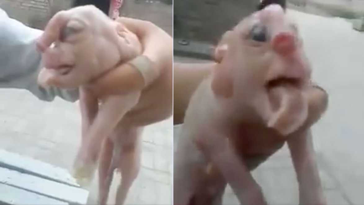 Chú lợn con được sinh ra với khuôn mặt giống người và cái vòi kỳ dị trên trán khiến người dân quận Diên An, thành phố Nam Ninh, Trung Quốc bàn tán xôn xao.