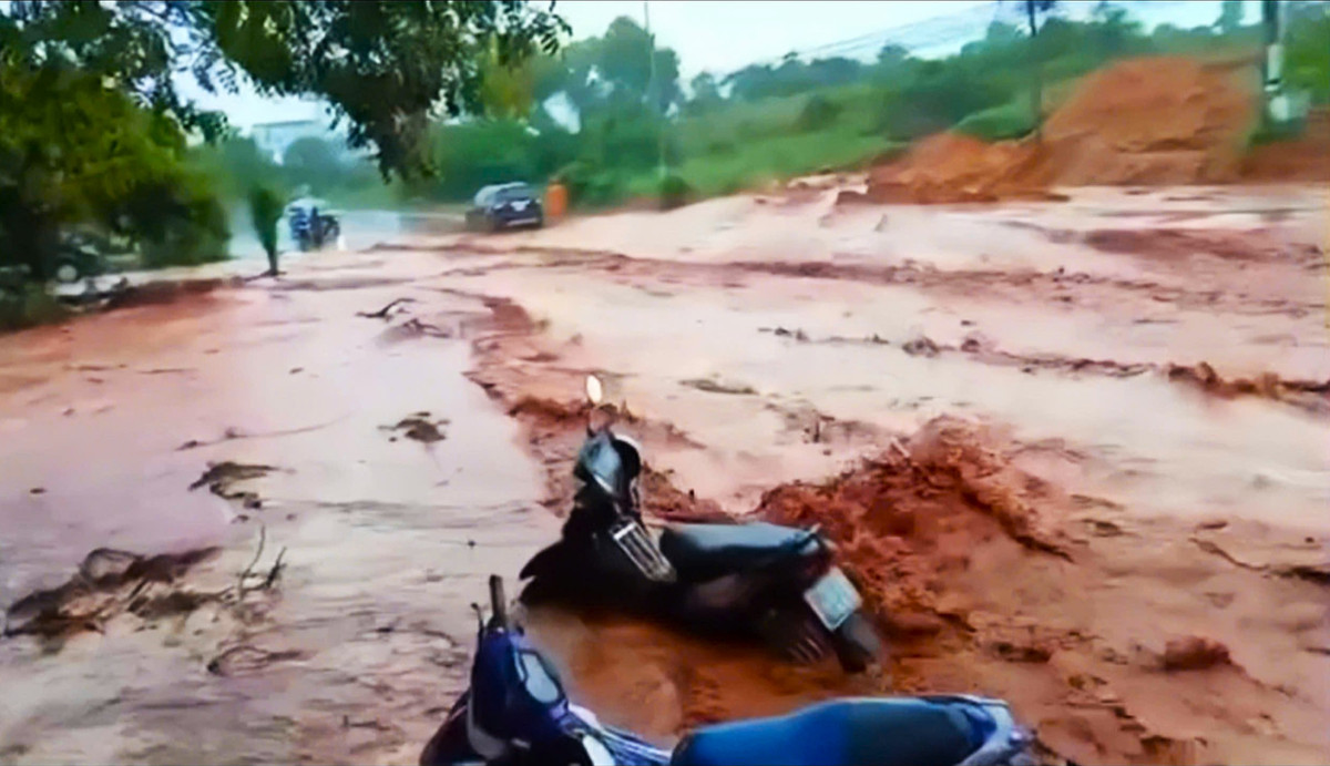 Lúc 13h30 ngày 3/9, một trận mưa lớn ở phường Phú Hài (vòng xoay Võ Nguyên Giáp, Tp. Phan Thiết) khiến lũ cát đỏ tràn ra đường, các phương tiện không thể qua lại.