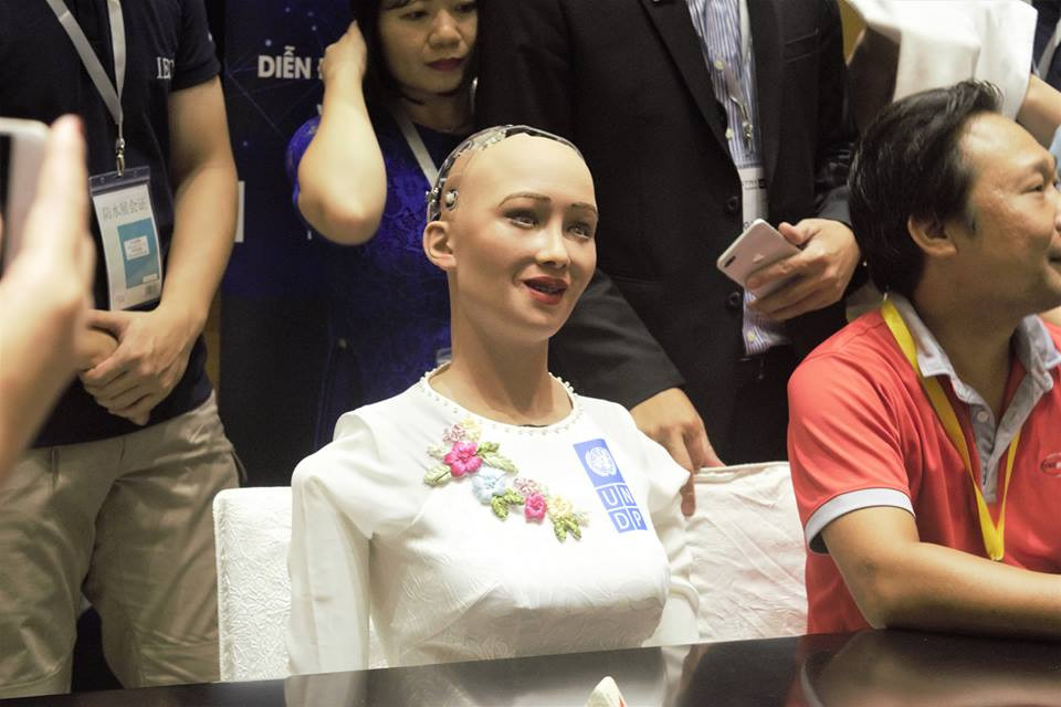 Tại Việt Nam, Sophia nhận được 3 câu hỏi về những tác động của Cách mạng công nghiệp lần thứ 4 đến Việt Nam. Cô rất vui vẻ trả lời các câu hỏi bằng tiếng Anh.