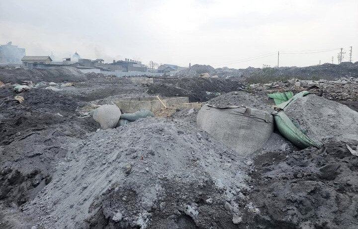 Các bãi chất thải độc hại chất cao như núi ở ngay ven đường trong cụm công nghiệp.