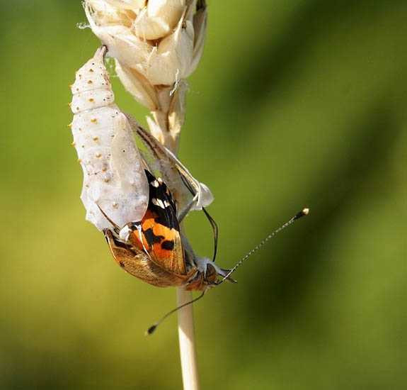 Bằng một cú đẩy dứt khoát, con bướm hoàn toàn thoát khỏi cái vỏ nhộng. Tuy nhiên đôi cánh còn ướt và quá mềm để có thể bay. Nó sẽ mất cả 1 ngày đợi làm khô đôi cánh. Di chuyển quá sớm sẽ làm tổn thương cho chúng.