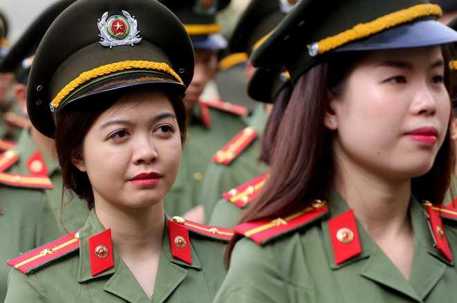 Thiếu úy Vũ Vân Ly (bên trái) thuộc Phòng An ninh kinh tế cho biết trang phục mới tạo cho cô cảm giác "thoải mái, chất liệu vải khá mềm mát và rất thẩm mỹ". Điểm mới trong trang phục nữ là màu sắc của cầu vai, cổ bẻ cứng. Trước đây cổ áo cả nữ và nam có cành tùng nay thay bằng hình công an hiệu.
