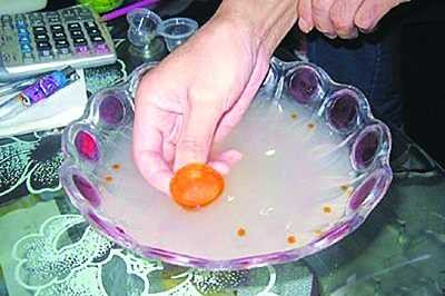Người chủ lấy một cốc nước, cho alginate vào và khuấy đều. Sau đó, người đàn ông này đổ vào một chậu nhựa đã có bột trắng bên trong. Dung dịch này có độ dính giống như lòng trắng trứng gà thật. Để tạo lòng đỏ, họ lấy một ít dung dịch alginate cho thêm màu thực phẩm để tạo thành dung dịch có màu vàng chanh.