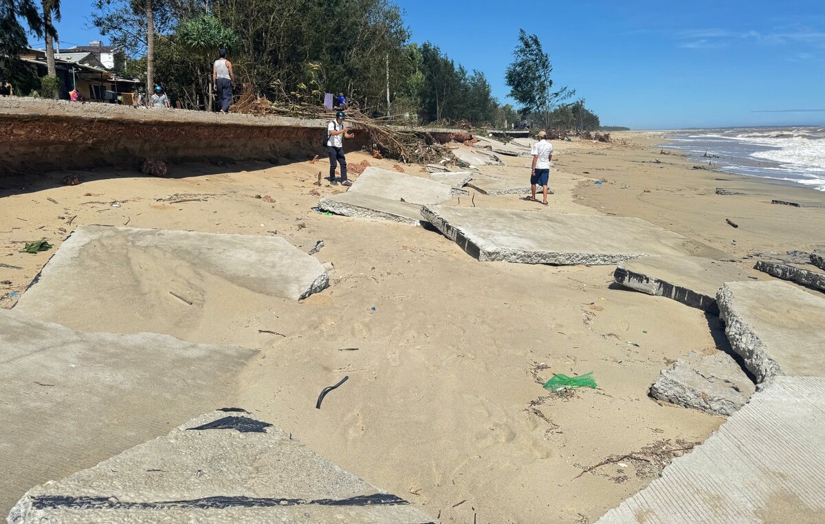 Theo người dân địa phương, sóng lớn cuộn trào do ảnh hưởng của cơn bão số 13 (đổ bộ đất liền hôm 6/11) đã công phá tuyến đường bêtông kéo dài hơn 200m ven bờ biển. Đoạn đường bị đánh tan tác này mới chỉ được xây dựng và đưa vào sử dụng cách đây 2 năm.