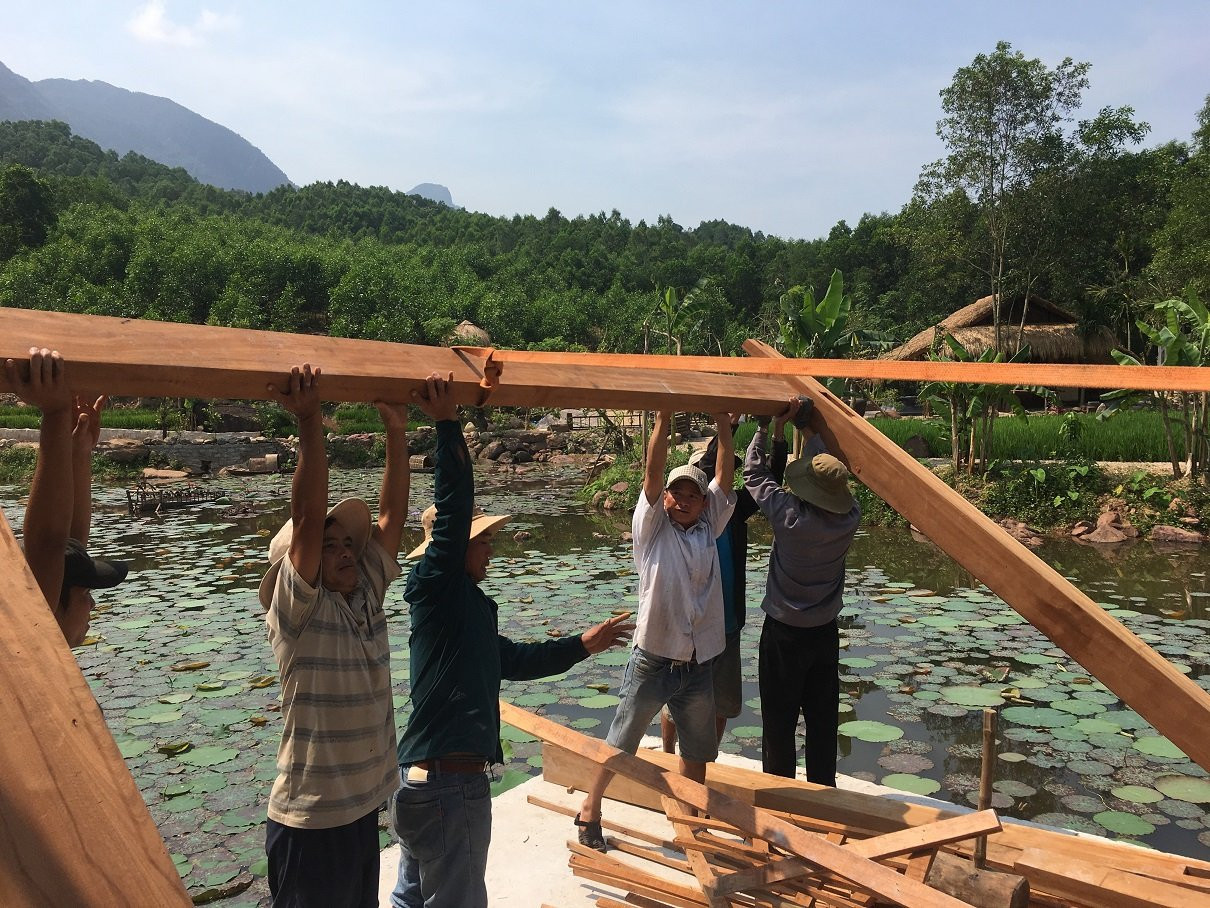 Nhóm công nhân thực hiện việc dỡ bỏ căn nhà gỗ dựng ngay giữa hồ nước, một trong số nhiều hạng mục được xây dựng trái phép trên đất rừng phòng hộ.