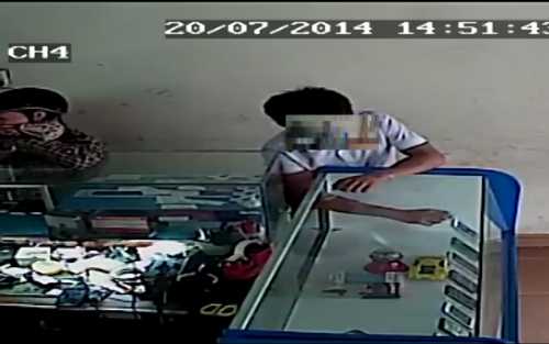 Lợi dụng lúc chủ cửa hàng đang đông khách phía trong, tên trộm đã nhấc tủ lên sau đó cho tay vào lấy chiếc điện thoại.